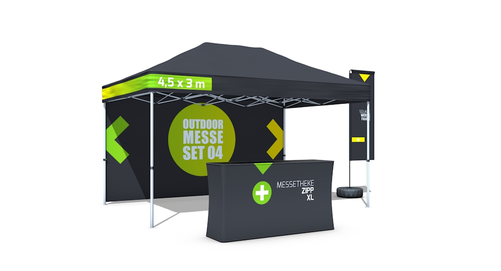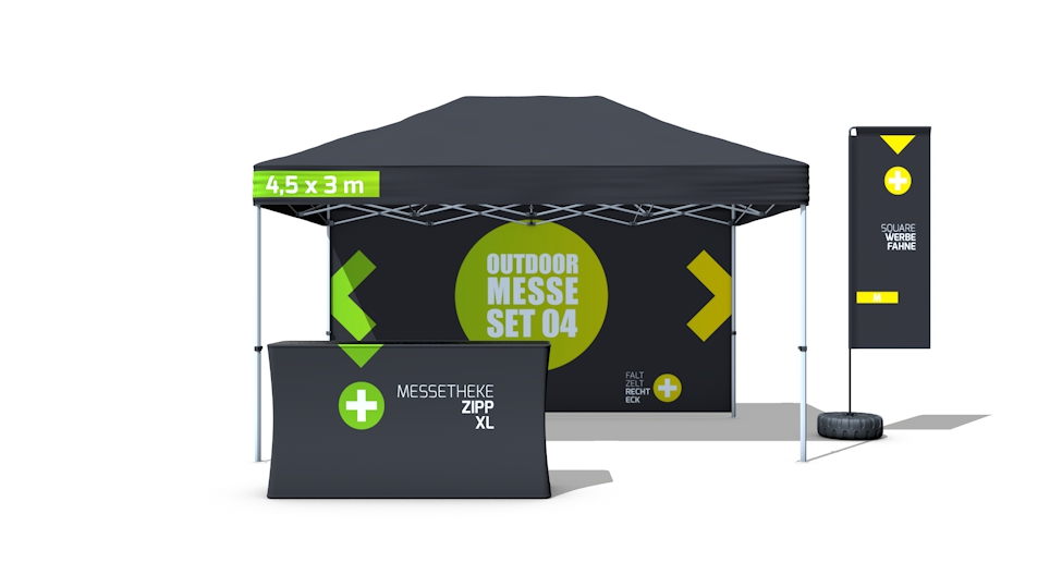 Sie planen eine Veranstaltung im Freien und suchen nach dem richtigen Werbestand? Das mobile Outdoor Messe Set 04 ist eine optimale Kombination aus klassischen und innovativen Werbeträgern. Das einseitig bedruckte Promotionzelt mit Rückwand schützt vor Wettereinflüssen, während die Werbefahne Square für die nötige Aufmerksamkeit sorgt. Mit der innovativen Messetheke Zipp-It haben Sie den perfekten Point of Sale für ein gutes Kundengespräch.