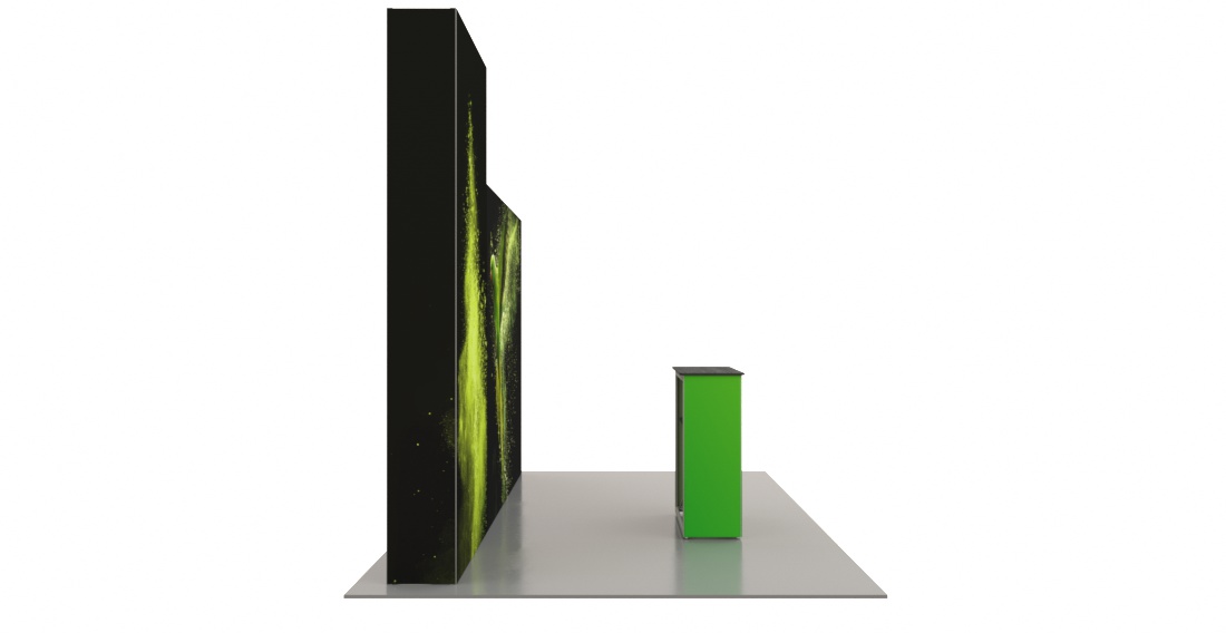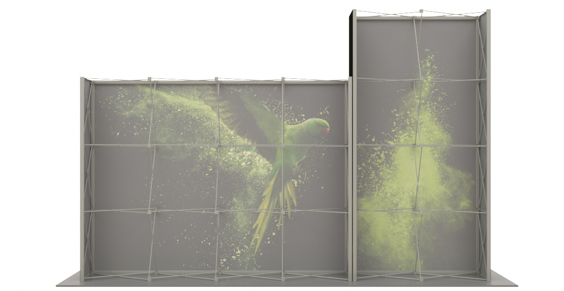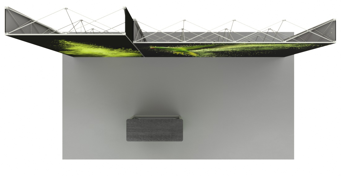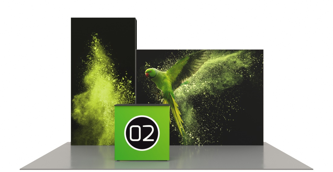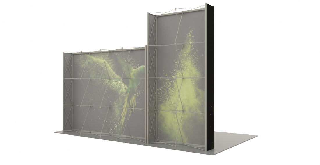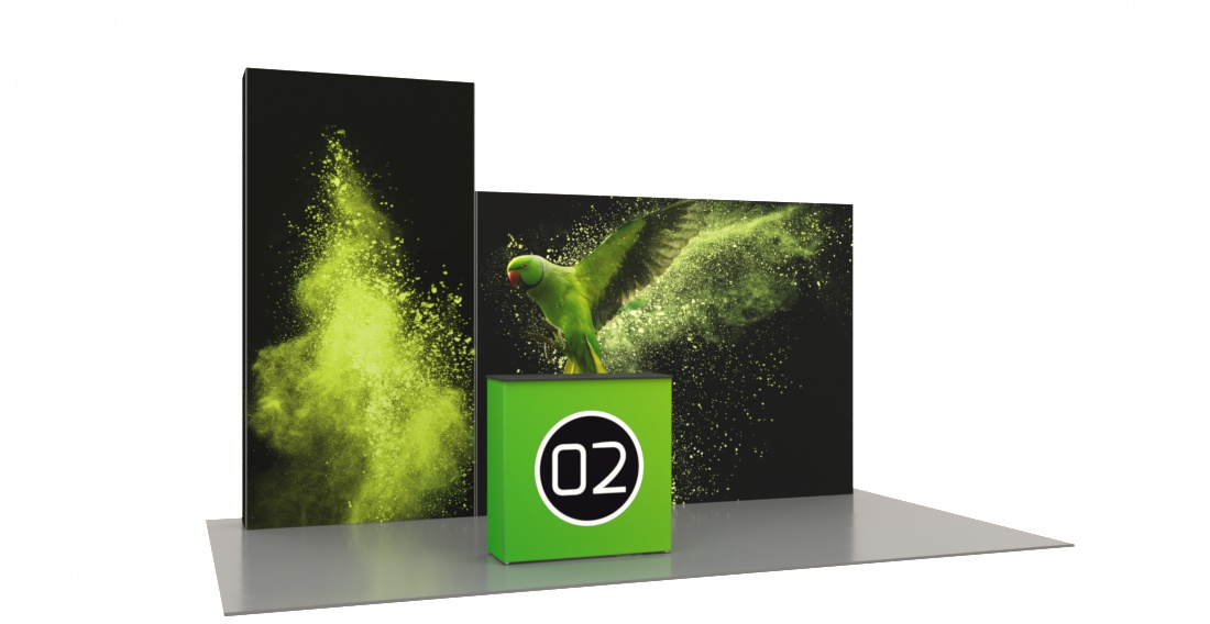 Der Textilfaltdisplay Messestand 02 kann sowohl als eigenständiger Messestand, sowie als flexible Ausstattung für sehr große Messeflächen genutzt werden. Die zwei Messewände bestechen durch ihre Maße von 151 x 298 cm und 298 x 224 cm. Insbesondere durch die erhöhte Position von fast drei Metern in Kombination mit der optionalen Hinterleuchtung verspricht der Messestand eine hohe Aufmerksamkeit.