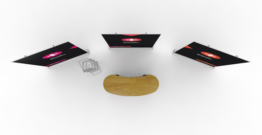 Die hochwertige und elegante Messetheke Black und Messetheke Premium setzt Ihre Werbung nachhaltig in Szene. Sie besteht aus einem Aluminium-Scherengittersystem und einem laminierten Druck aus PopUp Film sowie einer passenden Tischplatte. Dieser Messetresen ist mit nur wenigen Handgriffen von einer Person aufgebaut. Das System lässt sich einfach wie eine Ziehharmonika öffnen und aufstellen. Dann können Sie die Druckbahn mit Magnetstreifen am Gestell befestigen und sie nach Bedarf jederzeit auswechseln, indem Sie unter der Rubrik Nachdruck ein neues Motiv bestellen. Zum Schluss brauchen Sie nur noch die schwarz lackierte Tischplatte am System zu befestigen. Hierbei handelt es sich um eine MDF-Platte, die faltbar ist und durch bereits vormontierte Aluminiumschrauben am Thekengestell arretiert wird.